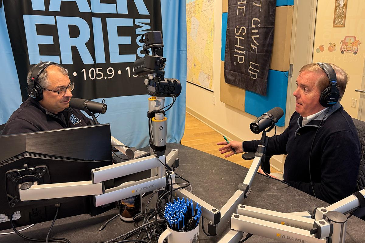 Joel Natalie interviews Steve Scully, Nov. 7, 2025. Photo by Shani Bills, TalkErie.com.