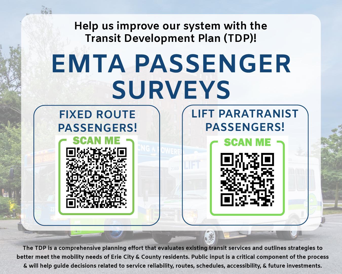 The Erie Metropolitan Transit Authority is inviting transit riders and community members to participate in a public survey as part of the ongoing Transit Development Plan (TDP). The survey is designed to gather feedback on current transit services and identify priorities for improvements over next 5 years.
